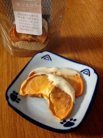 桜の塩漬けがしのばせてあるホワイトチョコを、柿のドライフルーツにトッピングしたもの。