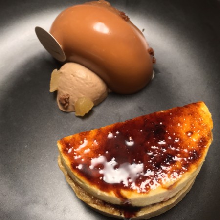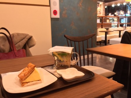 カモミールティに最初からレモンスライスと生ミント葉が入っているので、なにやら違うハーブティになってしまってる感は否めない。お菓子はパイ生地でカスタードプリンを小麦粉入れて焼き上げたようなものを挟んである。