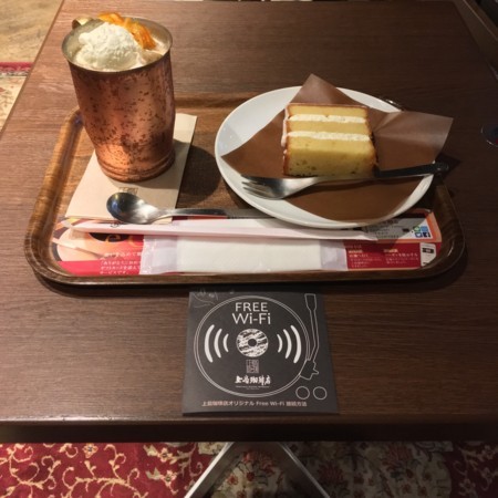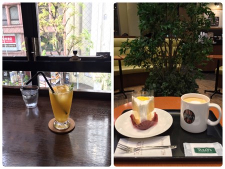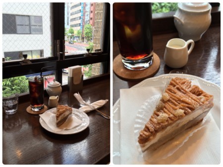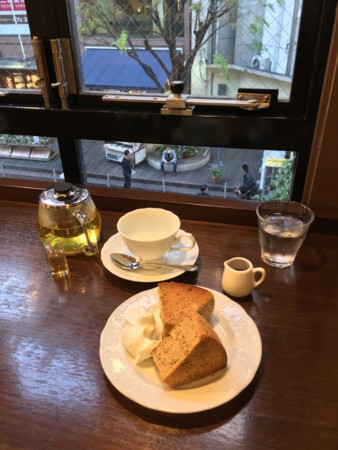 その2。いつものジャンボマッシュルームのソテーサラダのあと、店を変えて焼きシフォンケーキのメイプルシロップがけとカモミールティ。シフォンケーキを焼いて、かつシロップかけるの? と思ったけど、試してみたらこれははまりそう。