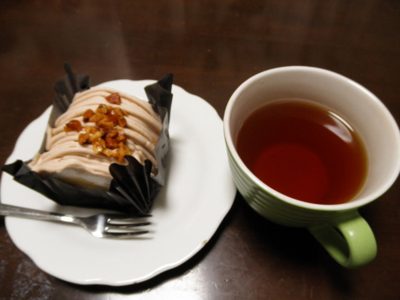 コンビニのモンブランとmeitoのレモンティー。モンブランの下の方はロールケーキになってた。