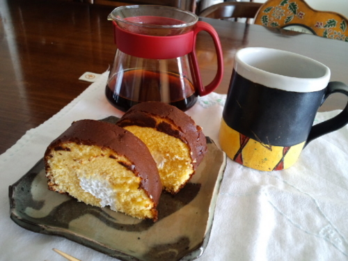 カルディさんの福袋のモカと、近所の和菓子屋さんのカステラ