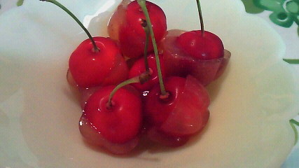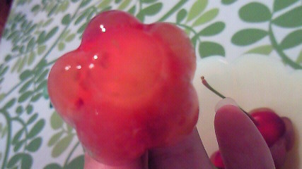 判りにくいのでアップで。寒天の中にも砕いたサクランボを入れてみましたよ♪(^p^)
