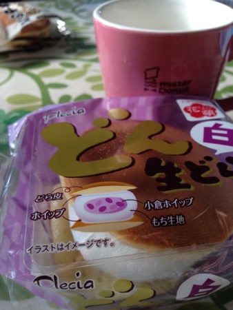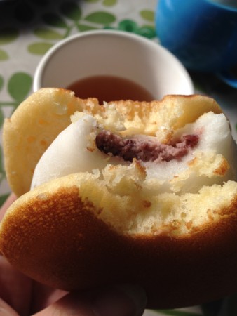 朝ご飯代わりに大福が挟まれた どら焼きを…黒どらもあった(餡子の中に求肥)