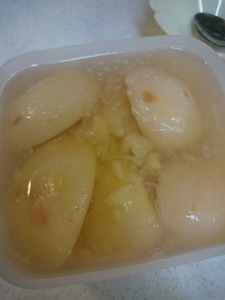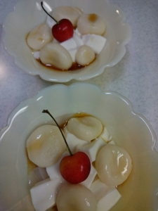 絹ごし豆腐を白玉に練り込んで、パイン+ナタデココ缶と合わせました。