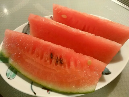 菜園に行ったとき畑友さんに小玉のスイカをいただいていました。