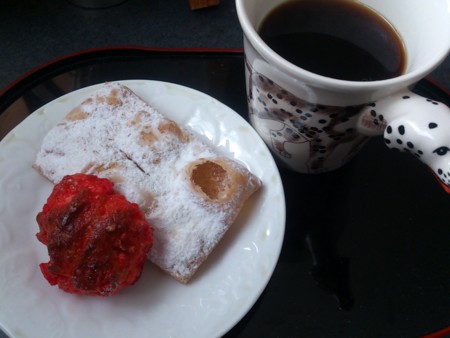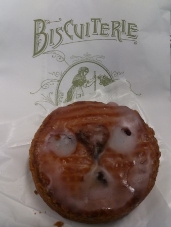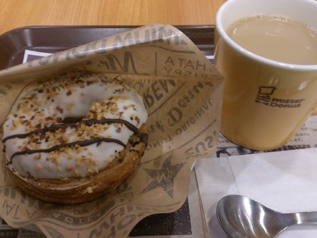クロワッサンドーナツ「ホワイトチョコ&キャラメルホイップ」とカフェオレ。