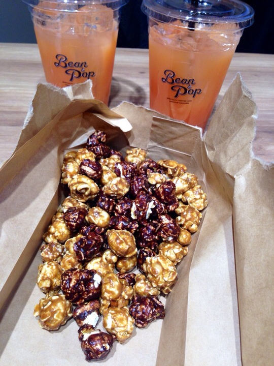 キャラメルとチョコのポップコーン、ピンクグレープフルーツジュース♪( ´▽`)