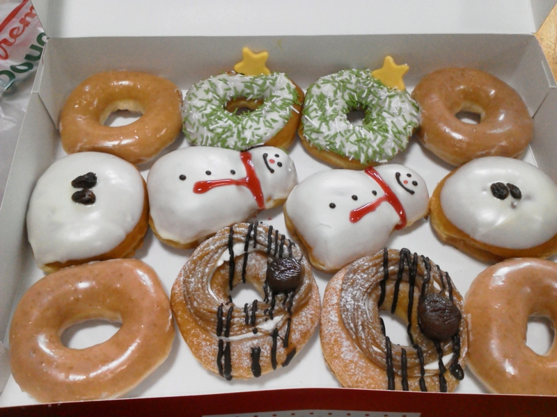 一人でパソコンを置く場所を作る為掃除してたら家族がお疲れ様と買って来ました(^o^)クリスピークリームドーナッツ、クリスマスバージョン☆