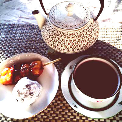 たいへんくせのあるフルーツティーと一緒にいただくおやつは焼きたてみたらしだんごと豆大福。