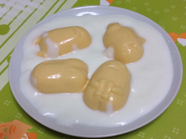 食後のデザートに、娘とぐでたまプリンキットを作ったよ。目玉焼き形のぐでたまそのもの。