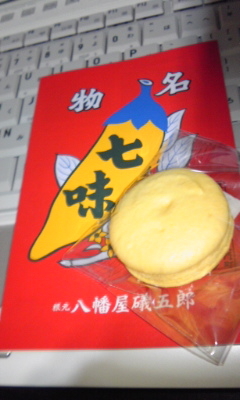 前から気になっていた七味マカロンですが、七個セットで1250円と自分おやつにするにはちょっと勇気のいる値段だったんだけど、バラ売りが始まっていたんで買いました。