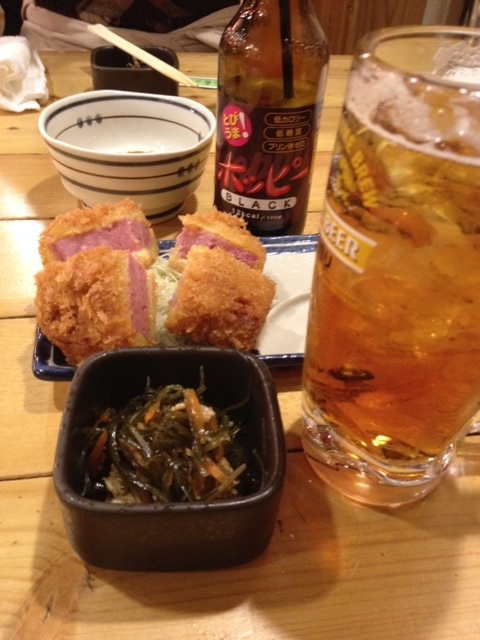 「ワカコ酒」のポップを見てハムカツ食べたくなって頼んだけど、めっちゃ厚切りで豪華なハムカツ出て来て、そこはかとなくこれじゃない感を感じながらの黒ホッピーでした。