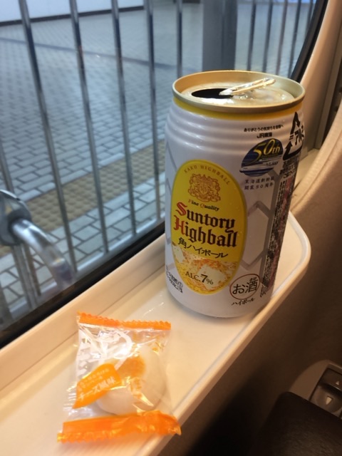 帰りの新幹線でチーカマをおつまみに角ハイボールをいただきます。