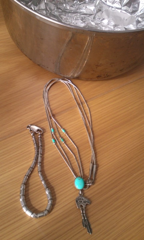 「銀の錆はアルミに塩と熱湯を注ぐと綺麗になる」と食器屋のおじさんが言っていたので錆び錆びの銀のアクセサリーで試したら目覚ましい効果があったのに、経過画像を撮り損ねた。