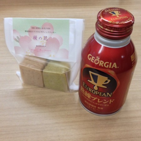 新しいジョージア買ってみた。ブラックがマズイと猿田彦珈琲本体もキライになっちゃいそうなので、まずはミルク入りで。缶コーヒーのブラックで、買ってもいいかなと思えるのは今のところ、タリーズのくらいです。となりのクッキーはマクロビものの季節限定、桜味。