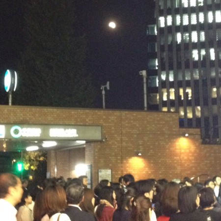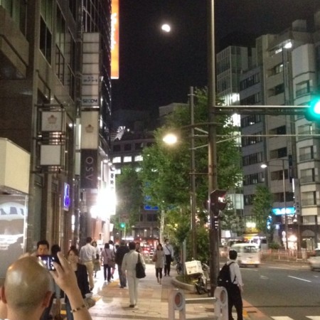 6時半ごろ、月が欠け始めたところ。お茶の水駅前では皆既月食レクチャーが行われて、人だかりになってた。月の見える道ではみんなバスでも待つように歩道に佇んでて、不思議な風景でした。稲垣足穂っぽいというか。