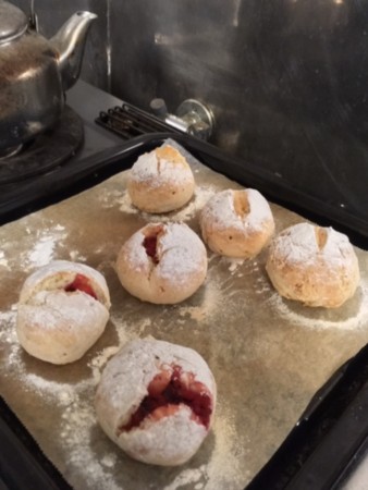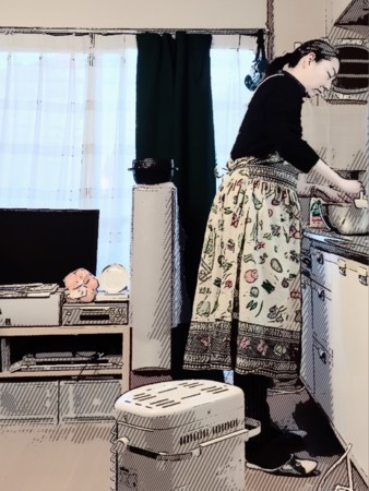 帰宅後もいろいろやることあって同人誌手つかず。やること、のうちにパンを作って焼くことも入っており、久々にちゃんとエプロン。粉がつかないようにね。