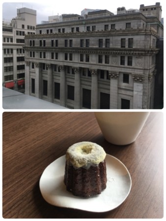 お値段的に、とか季節的に(盛夏用着物とか絶対に無理!)無理な、見るには素敵なコーディネート例をたくさん見たらクラクラしてきたので、会場隅で過疎ってるカフェで日本橋の建物を眺めて富士山カヌレとほうじ茶で一服。