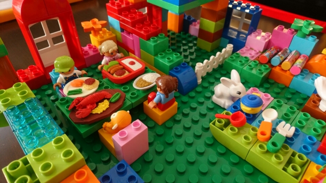 ご覧ください、レゴ(デュプロ)の人形にぴったりのサイズ。娘はこれで「こっこおみせ」を開いて遊んでいます。