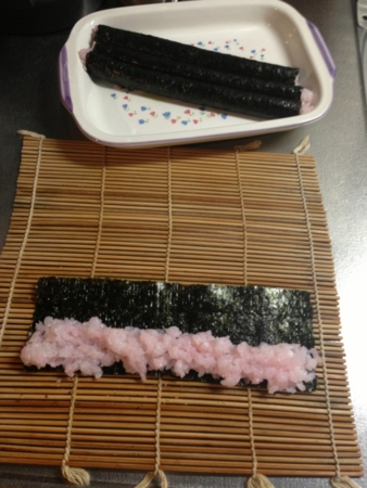 1/3に切った海苔に酢飯に桜でんぷを混ぜて