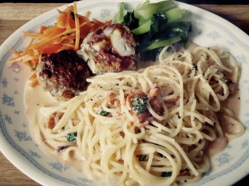 稲庭うどんに煮玉子と蕪の葉をのせて、煮豚の煮汁をかけました。個々はおいしかったけど、マリアージュとしては失敗。やはり稲庭うどんはもっと上品にいただかねばならなかった。