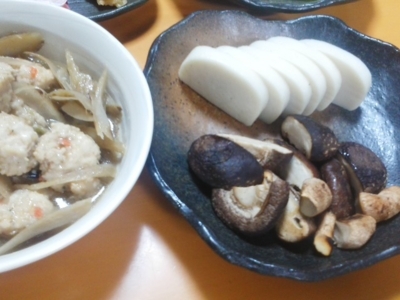 ・湯葉、小松菜、えび団子(海老のすり身で作ったよ)、蓮根、筍の炊き合わせ 他