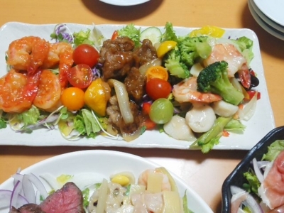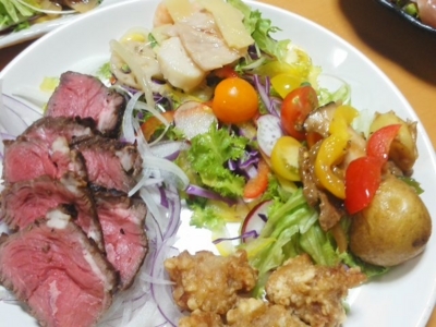 昨日、手羽中に味つけしてたもの、ビーフサラダ(薄く切りすぎたのはご愛敬(^^;))