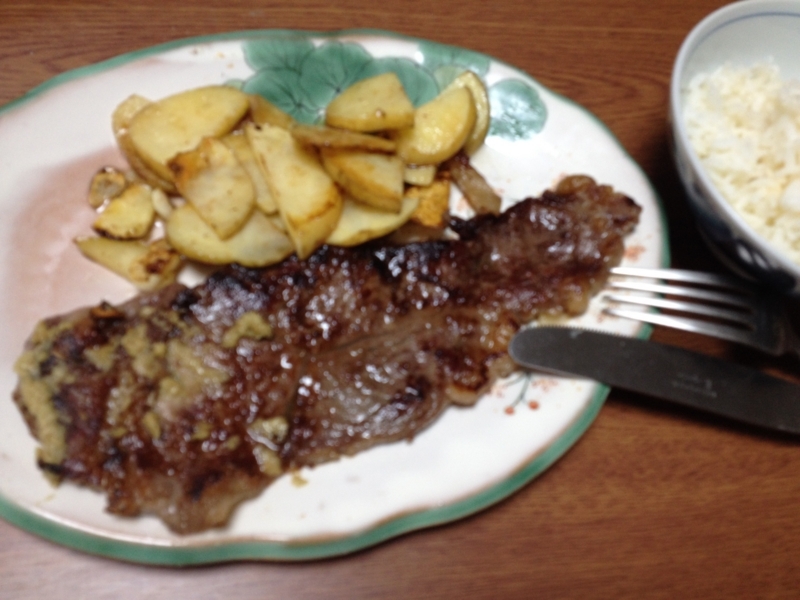おめあての洋食屋さんは夜の開店時間になっても空いてなかったので、ホームセンターの喫茶室でおやつがわりにコーヒーとパンを食べたところで、昨日景気付けにステーキ肉を買っていたのを思い出したんですよね。
