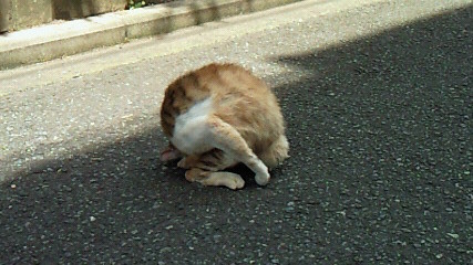 奥の猫はいつでも逃げられる構え、手前の猫は堂々と毛繕いしたまま…。 (^p^)