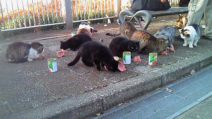 ある公園で、捨てられた猫達(およそ12匹ほど)に食事を与えてた。