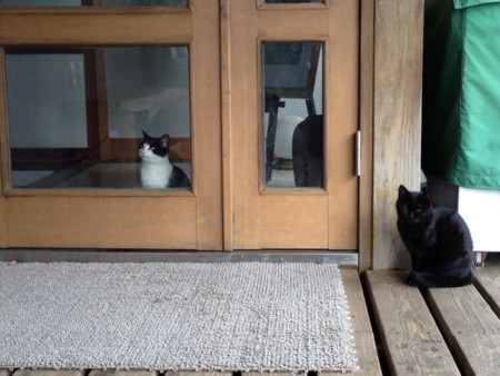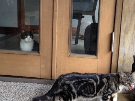 アメショーミックスかな?と見ていたら、室内から白黒ちゃんの視線が・・・