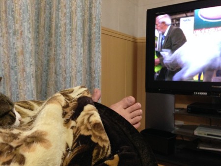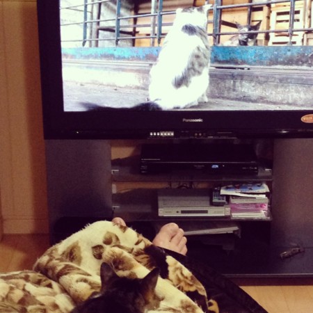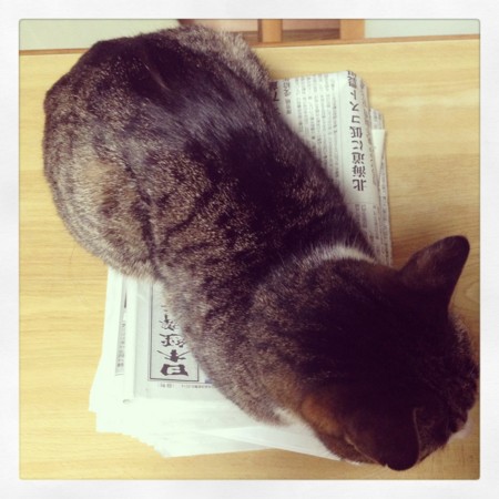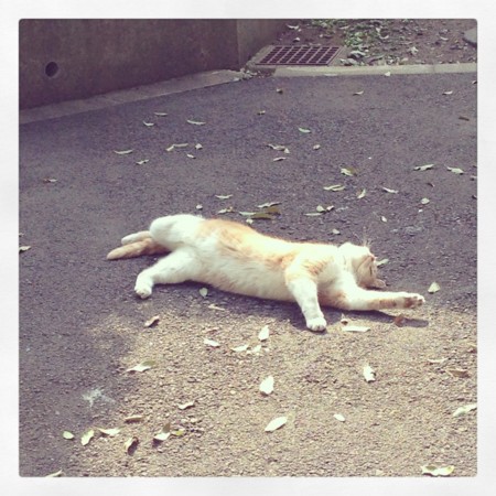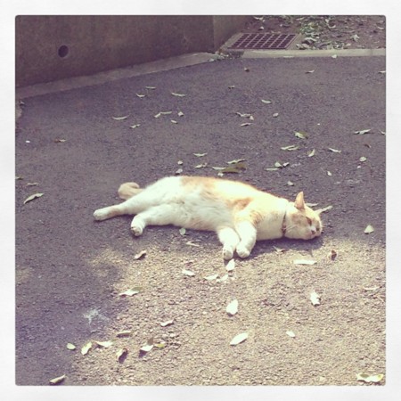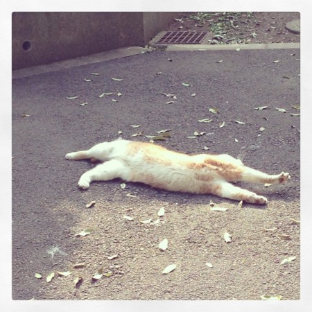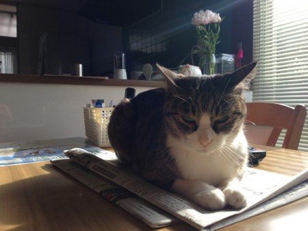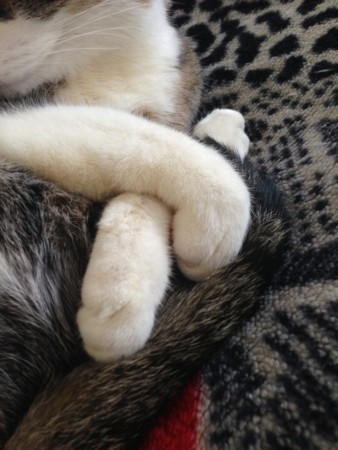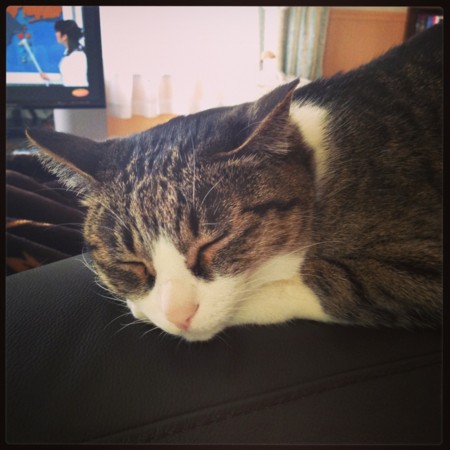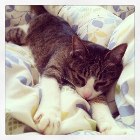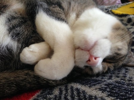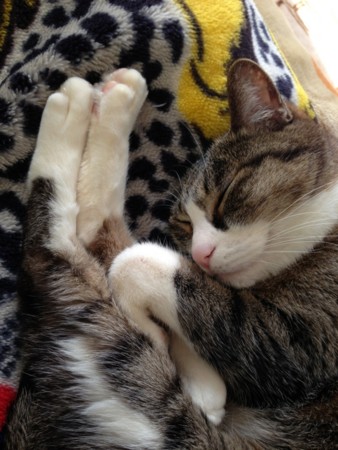 目覚まし前に家族を起こして回る仕事を終えた猫の朝寝の姿です。