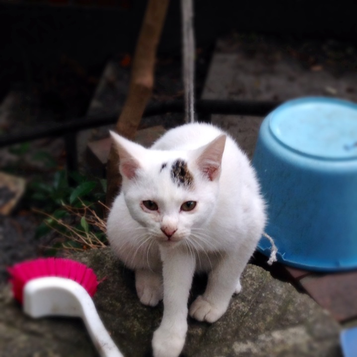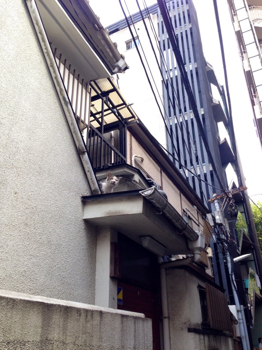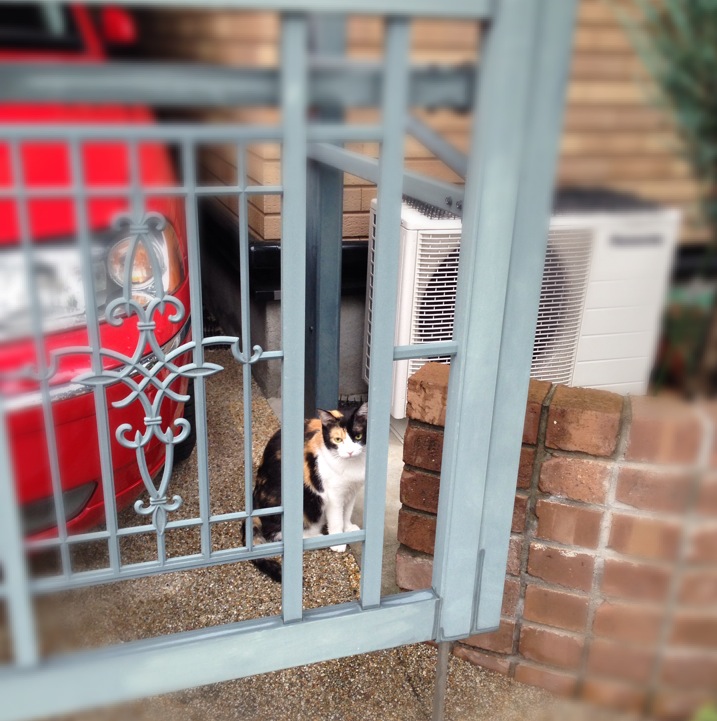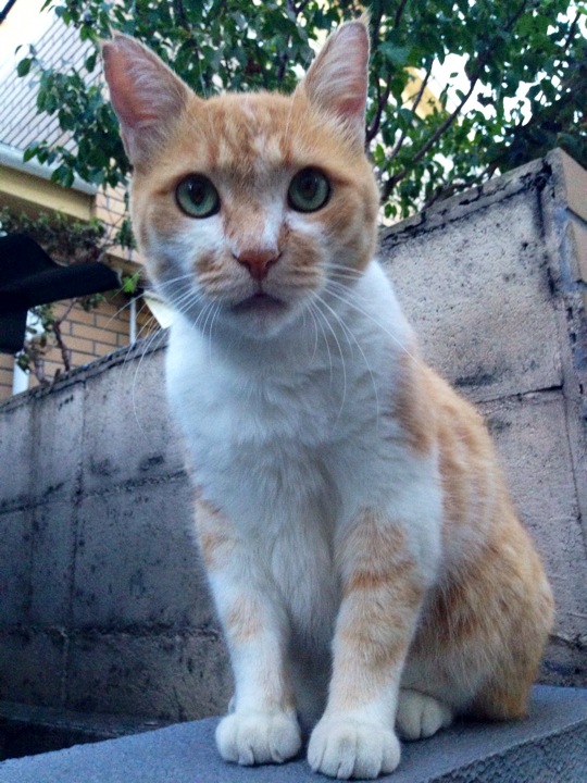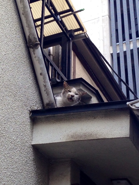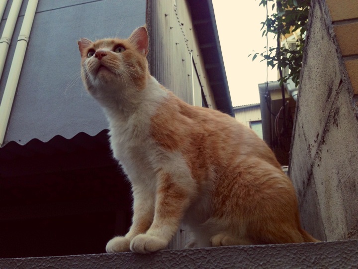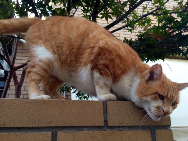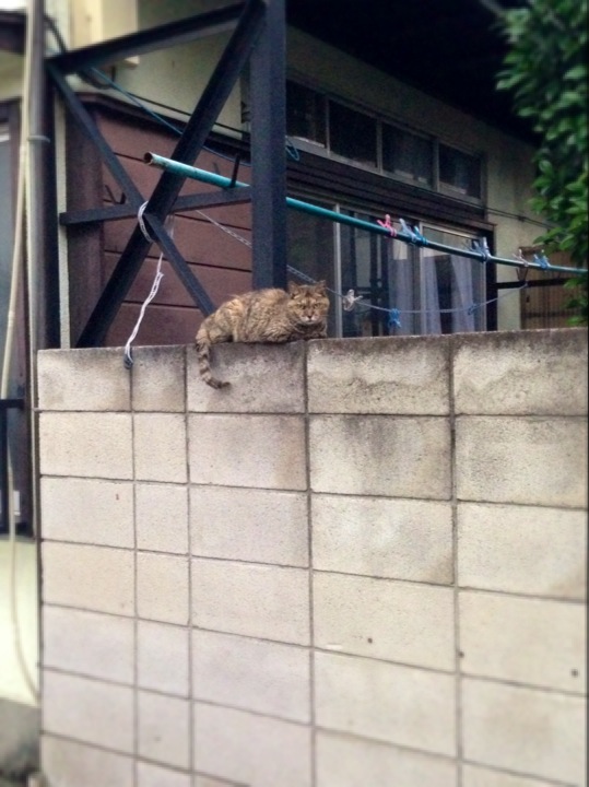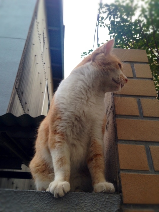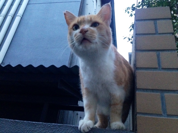 向かい側の塀の上にいる白猫さんとにゃあにゃあ会話してました。
