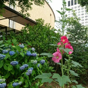 タチアオイの花がてっぺんまで咲いたら夏がくるの観察。