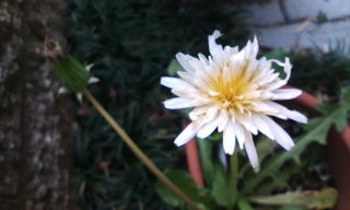 一昨年、種を(あのまあるいふわふわ)とって撒いたシロバナタンポポで、気がつかないうちにひっそり開花していた。二つ目の花でした。植木鉢をもう一個増やそうかな。地面に生えるとコロ父に抜かれてしまうから。