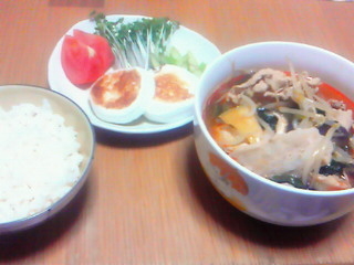 今夜は厚揚げと小松菜の煮物にアスパラ
