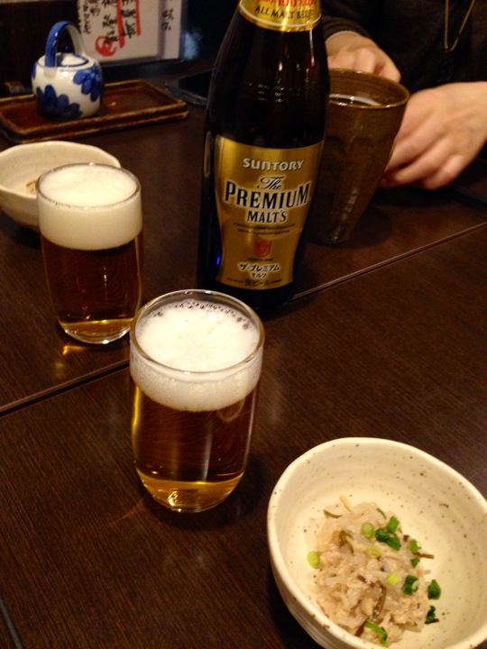 今日は瓶ビールと日本酒を冷でいただきましたよ〜。