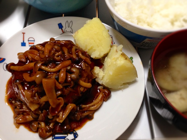 ハンバーグきのこソース&新じゃがのオーブン焼き、レタスとチーズのサラダ、冷奴、なすの味噌汁、ご飯。
