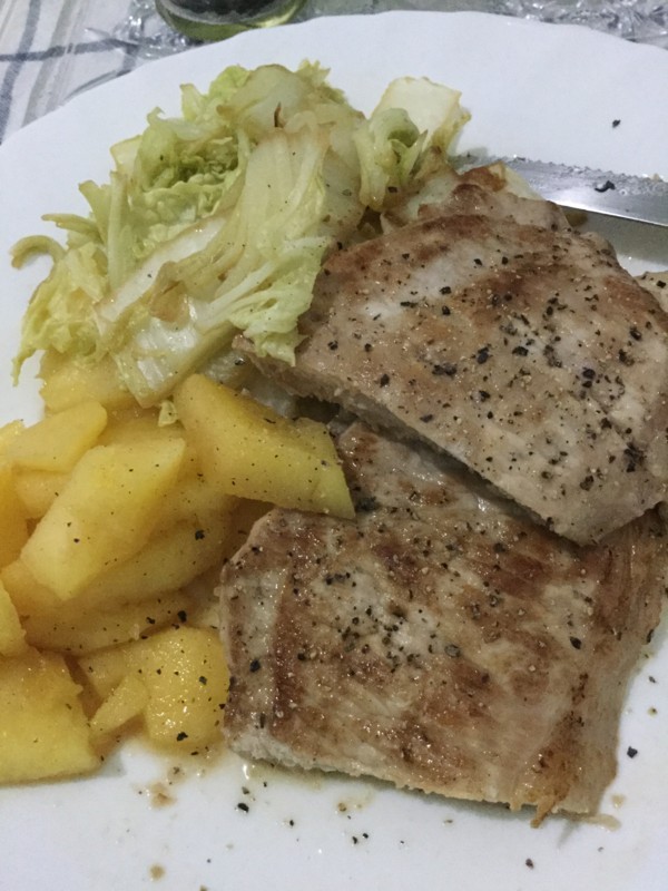 オリーブオイルとバターで両面をよく焼いて、肉汁で野菜を炒めて、いただきます!
