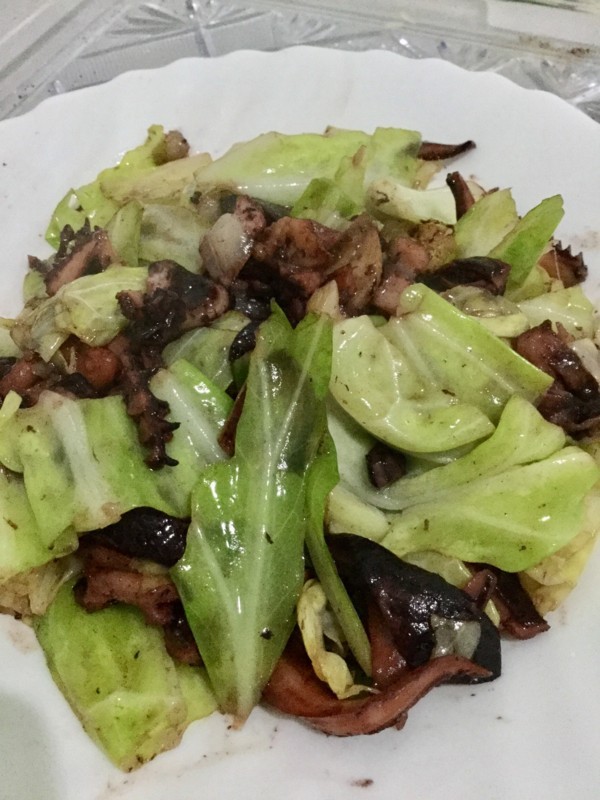 廃棄物的なタコの部位をニンニク&オリーブオイル&キャベツで炒めたもの♪ と、ロミオとジュリエット(グァバペーストとミナスの白チーズ)。