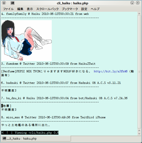 $ haiku.php twitter -h | sed -e "s/^RT.\+/あぼーん/g" | w3m -T text/html