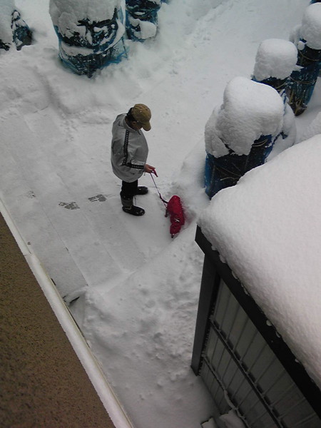 服は着ないわんこだけど、さすがに病床にこの雪なので、赤いコートを着ています。これ…多分10年以上前に買ったの…。