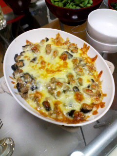 今日の酒のつまみは、つまみは手作りのアントルメとか、茄子味噌のチーズ焼きとか。