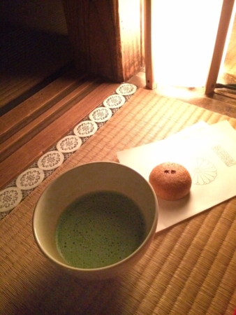 青蓮院の庭園ライトアップを眺めながらお抹茶一服。