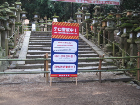 春日大社にテロ警戒の看板あり。不思議ではないが信仰の場所のテロは止してくれないか、と単純に思う