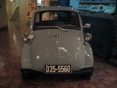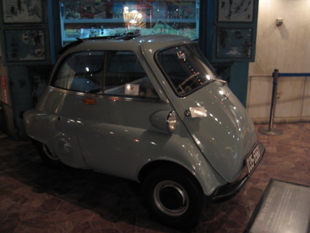 BMWイセッタっていうほぼ二人乗りのえらい小さいクルマです。幅が1m40で、長さは3mありません。BMWが1950年代にイタリアからライセンス供与を受けて生産していた自動車です。フロント部分がドアになっていて、そこから乗り降りします
