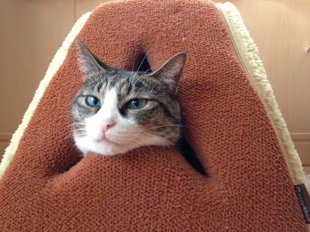 ホットカーペット的な物が入ったハウスから顔を出して得意げな実家の猫。