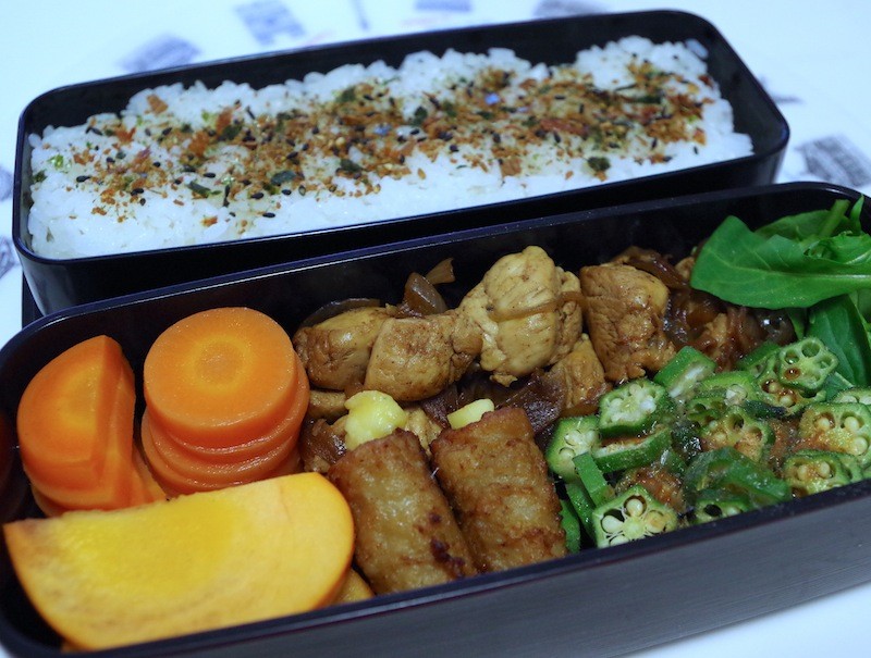 ふりかけご飯(おかかごま味)、ベビーリーフ、オクラのおかか和え