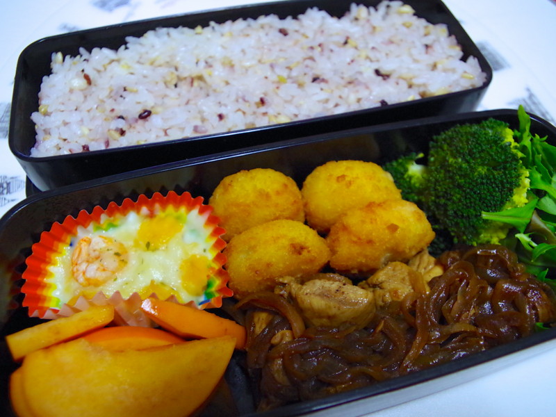 鶏ささみと玉ねぎの炒め物(ソース味)、肉巻きポテト、人参のレモン煮、富有柿