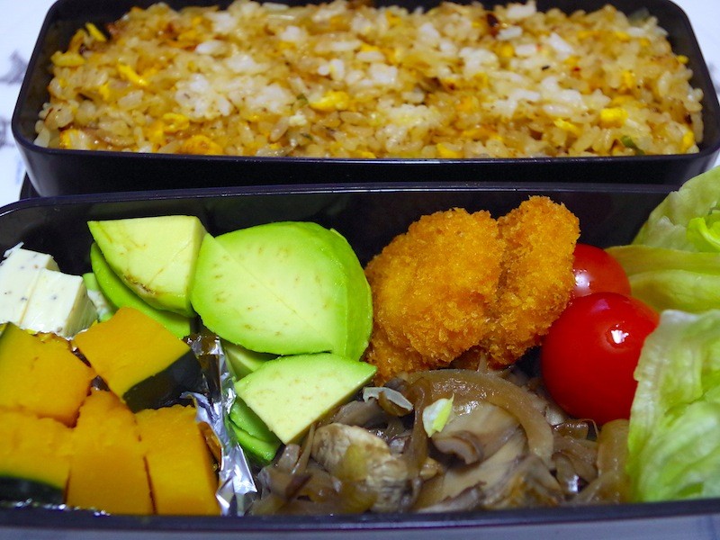 玉ねぎと舞茸の炒め物、アボカド、南瓜の煮物、黒胡椒入りチーズ